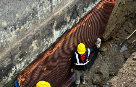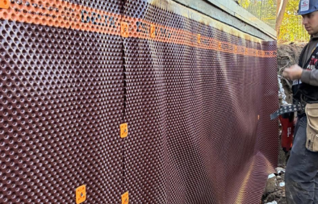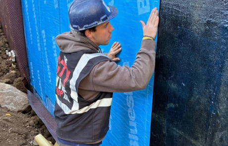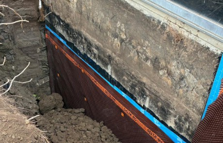 Apply new drainage membrane (Delta MS) and rubber bituthane membrane (BlueSkin WP200).