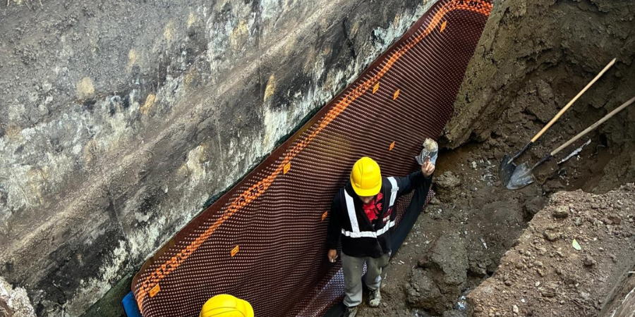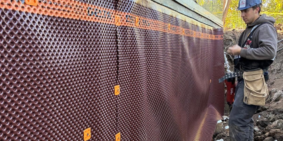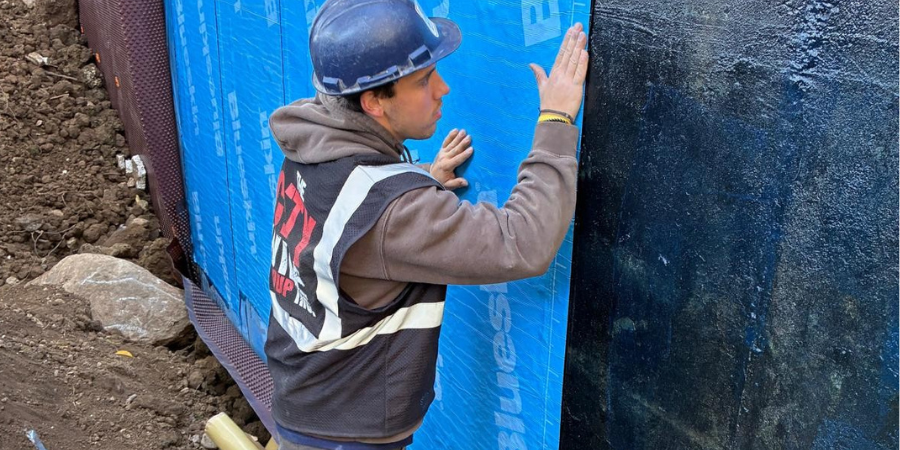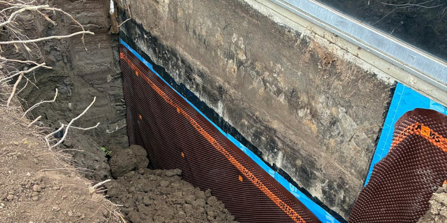 Apply new drainage membrane (Delta MS) and rubber bituthane membrane (BlueSkin WP200).