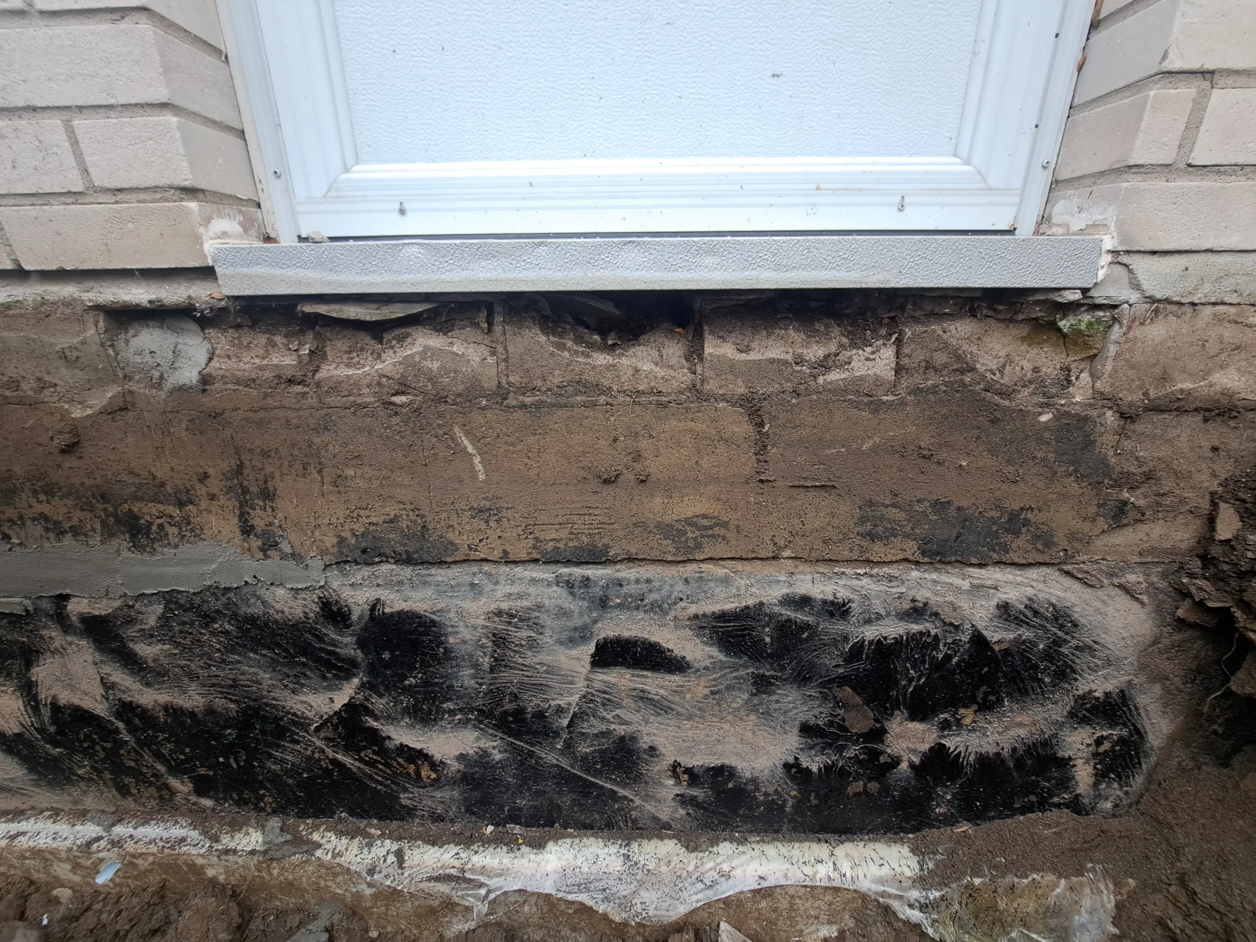 Necessary parging repairs completed to create a smooth and sealed surface in preparation for waterproofing.