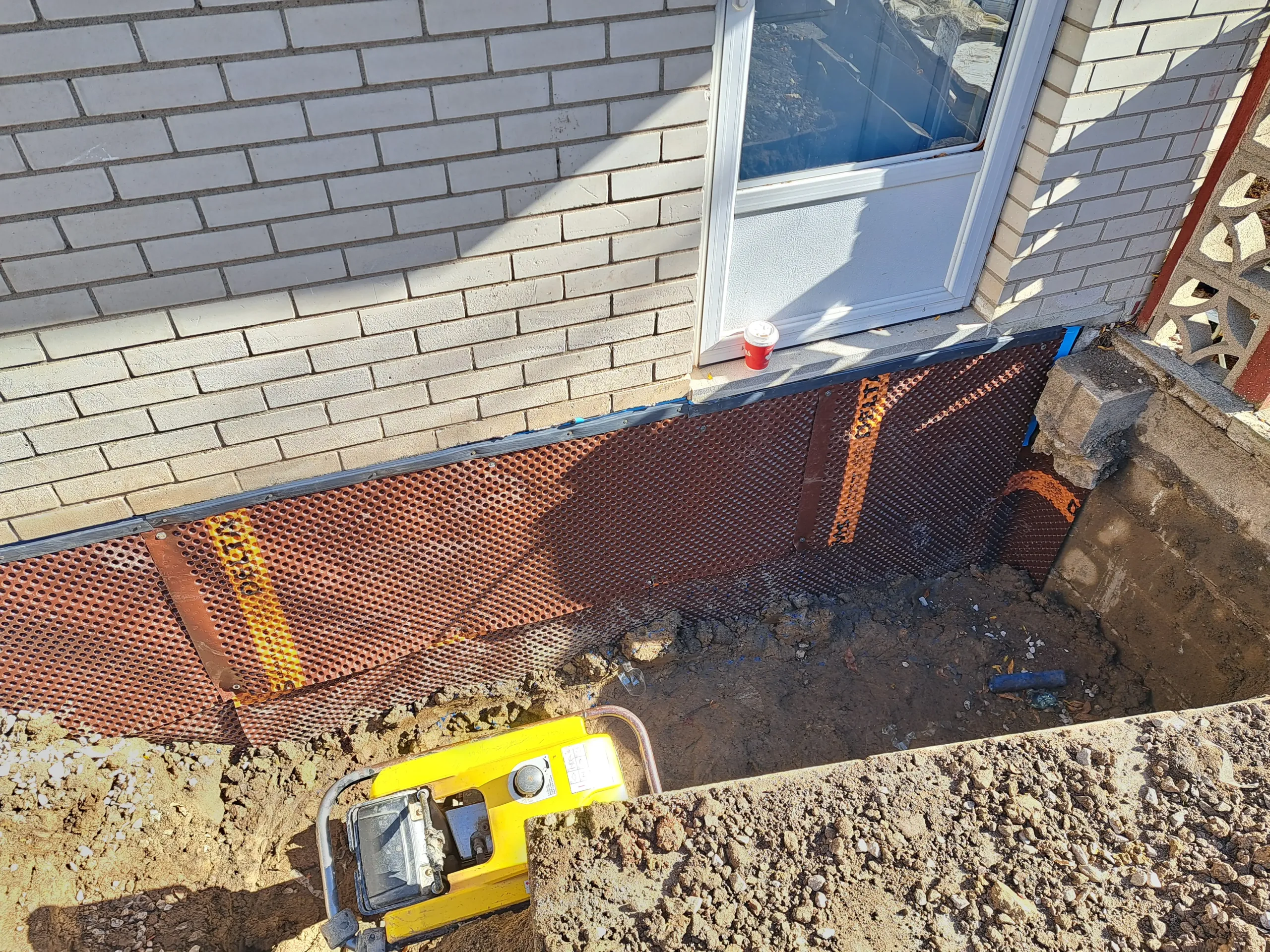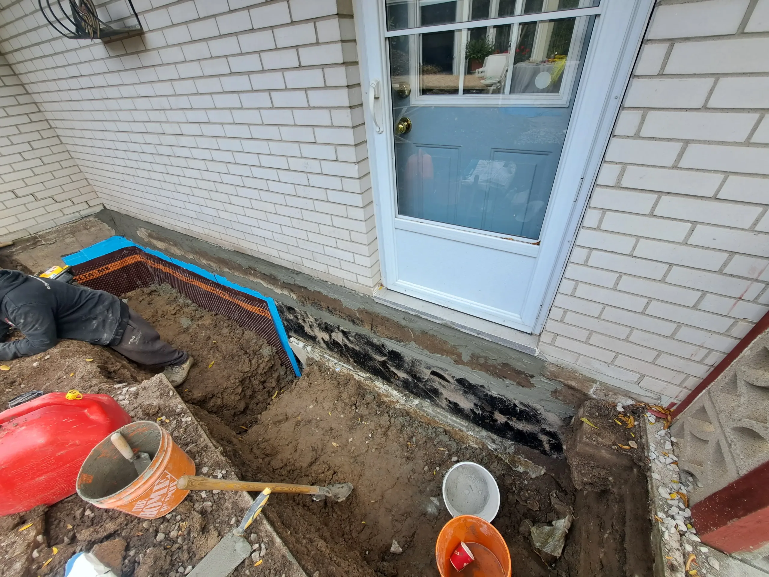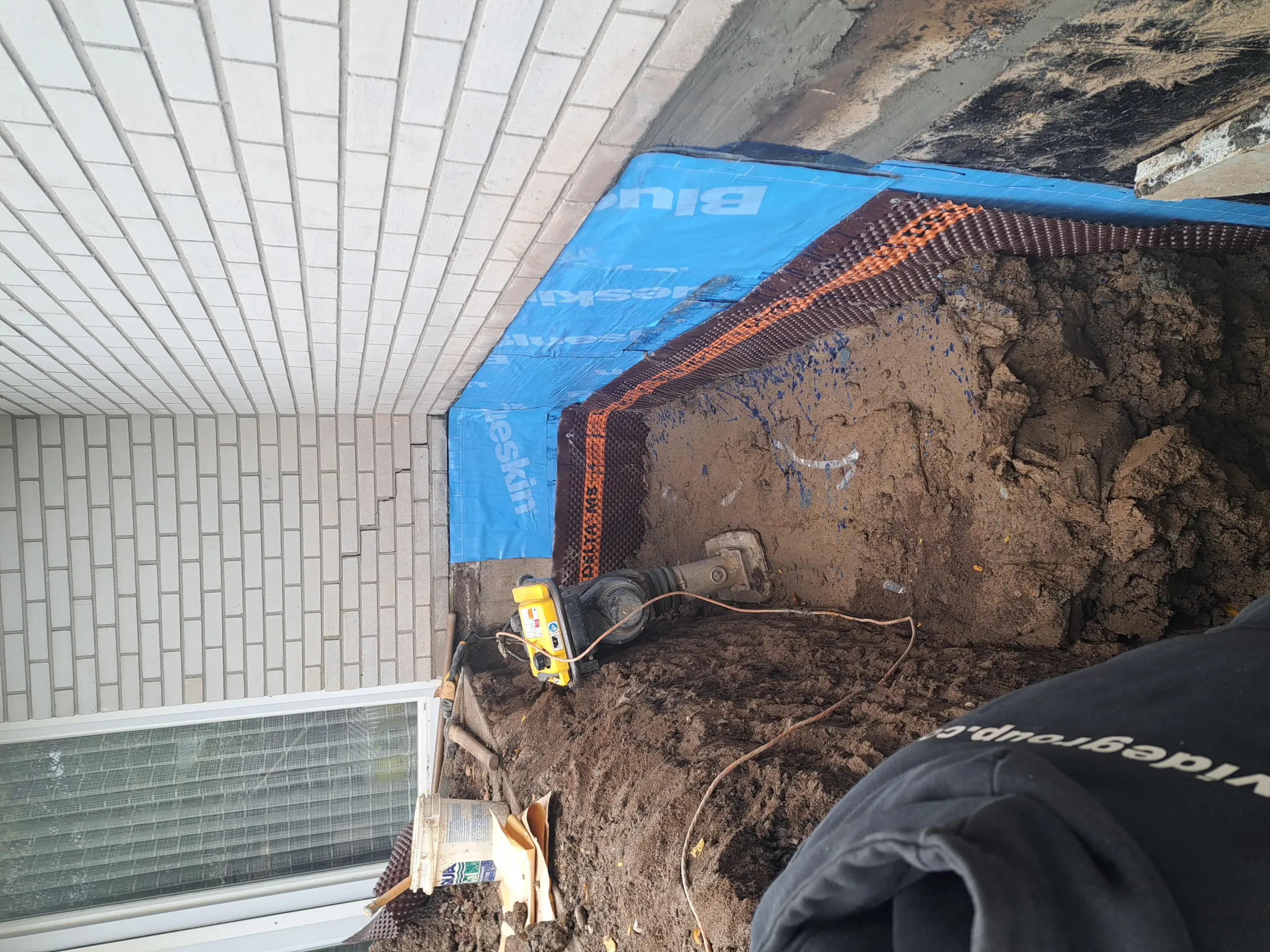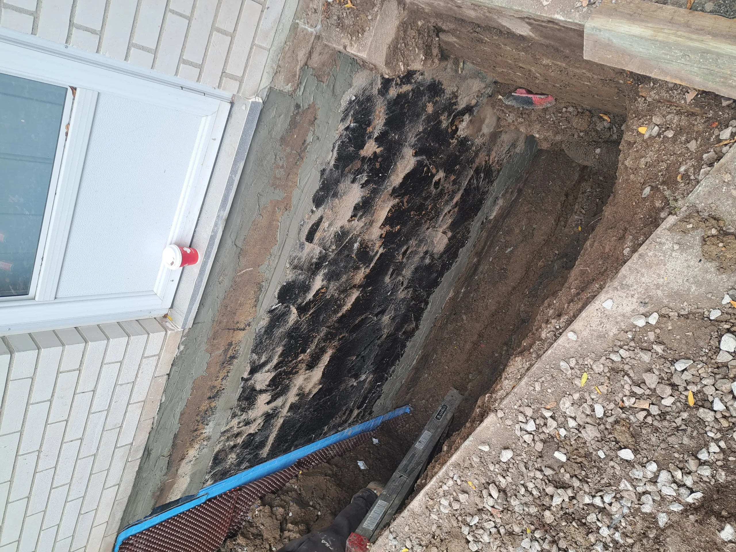 Applied rubberized membrane (BlueSkin WP200) to foundation wall to create a fully bonded waterproof barrier.