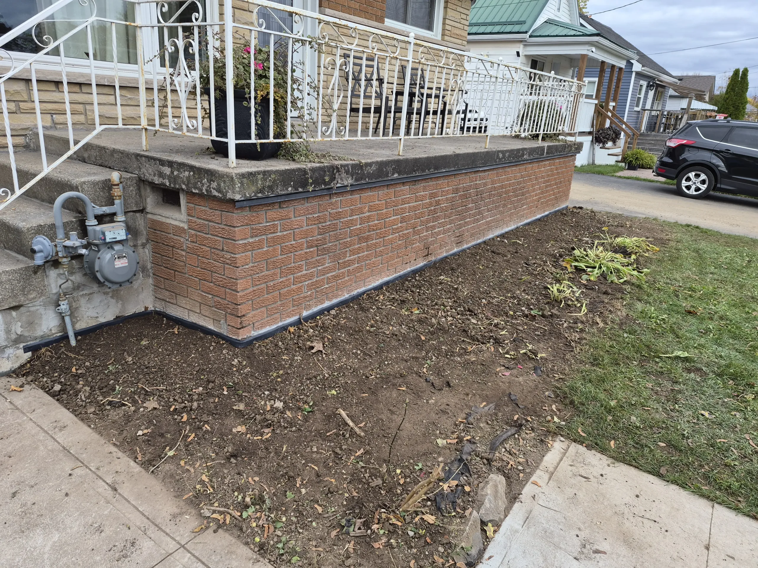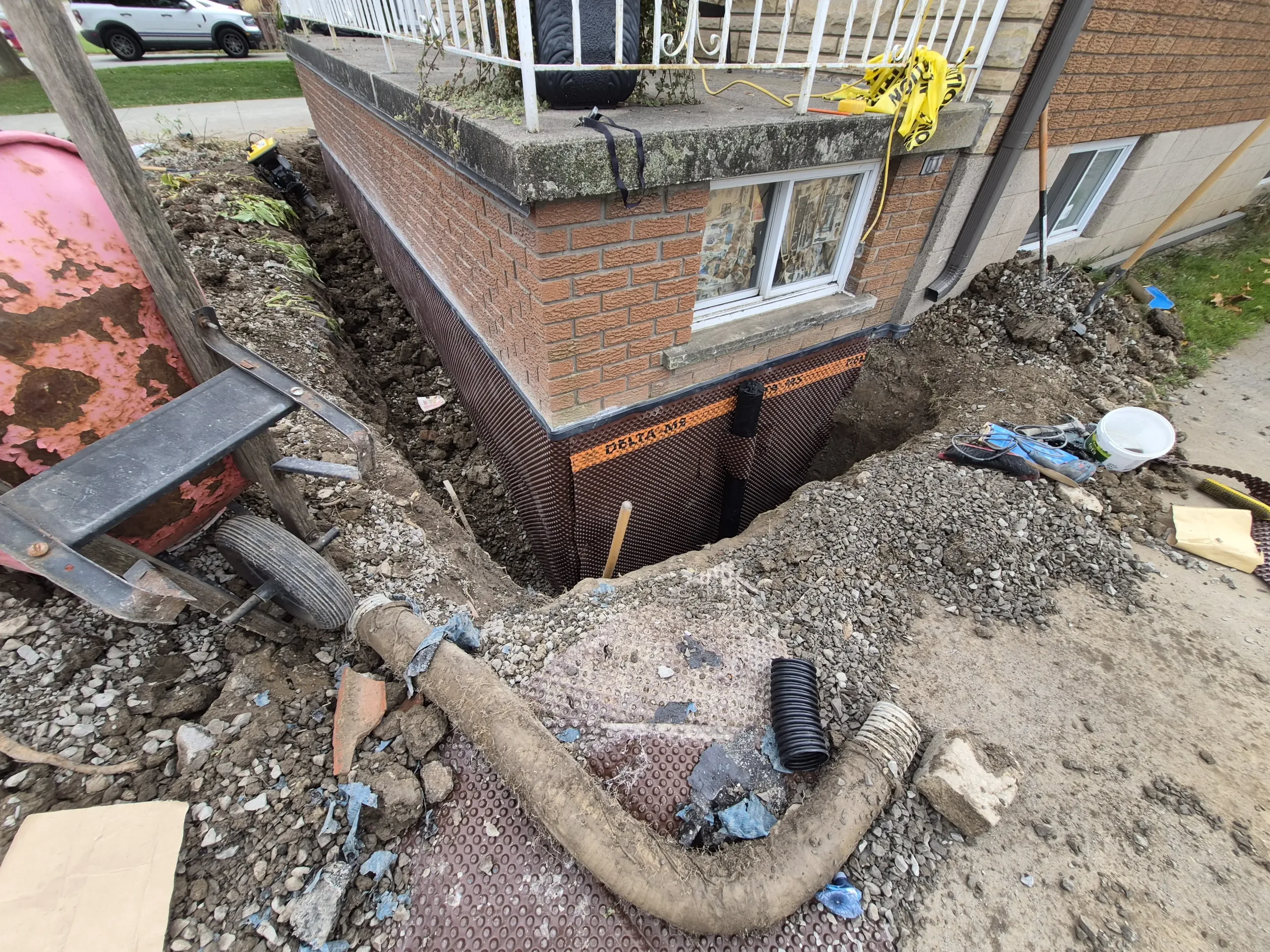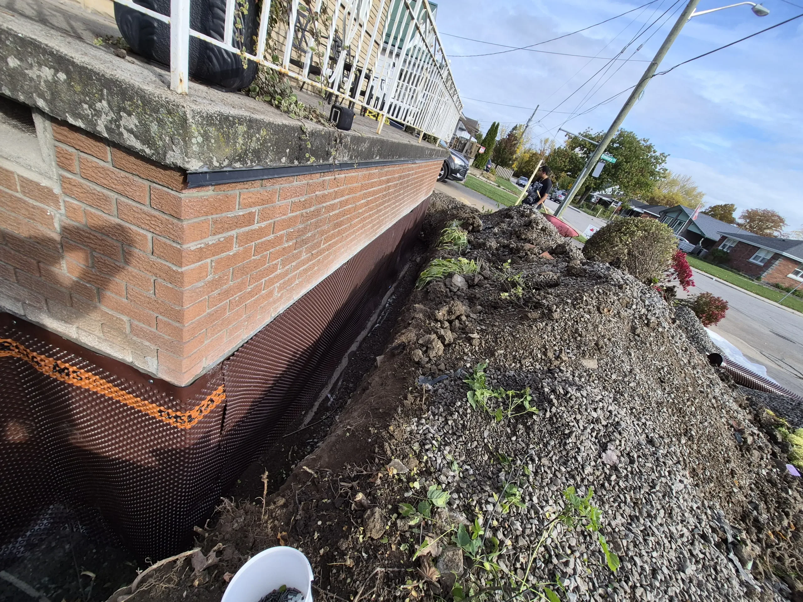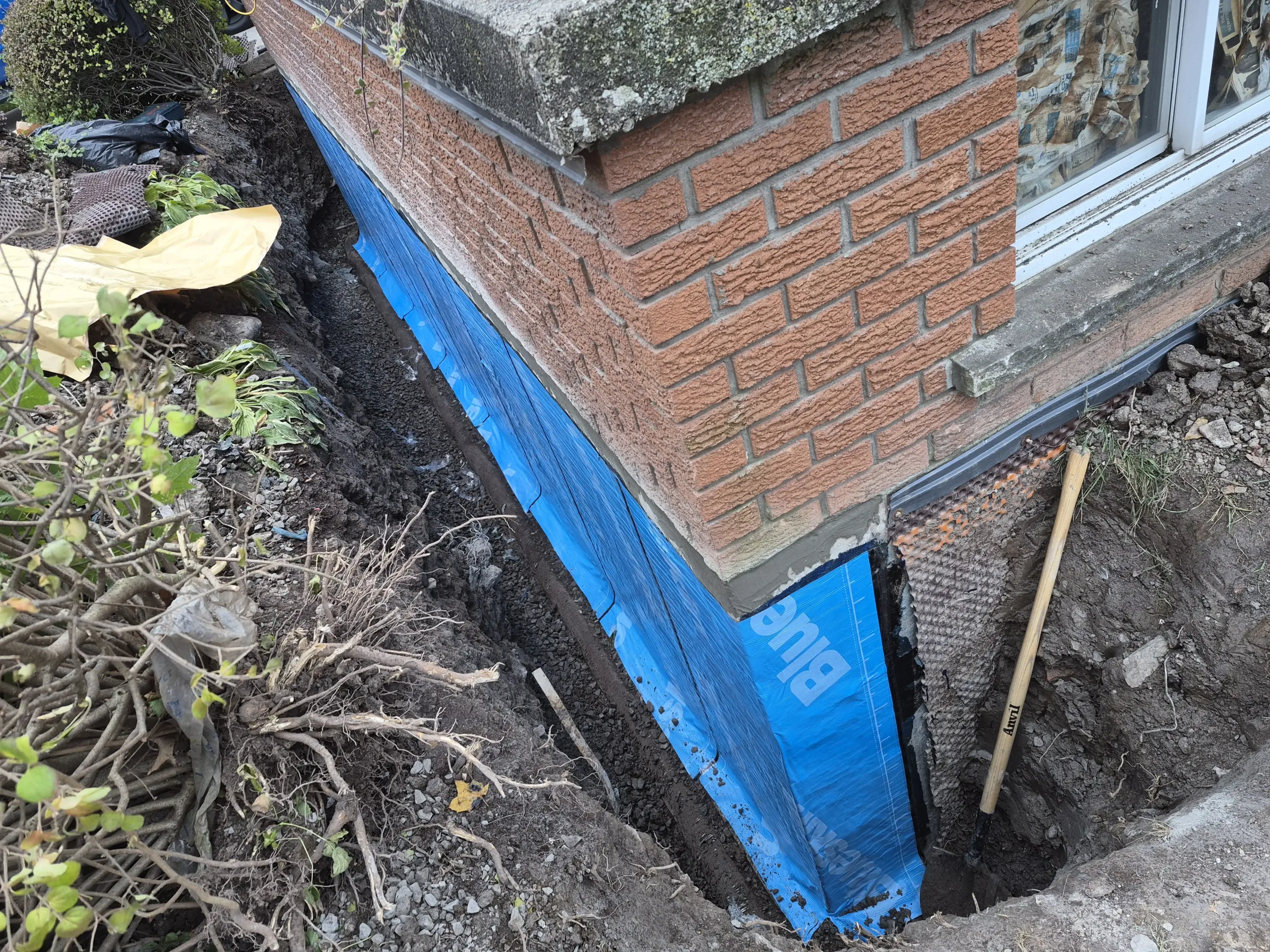 Exterior waterproofing was successfully completed at 423 Talbot St, Hamilton. The repairs addressed the damaged and compromised areas, replaced the defective membrane, and removed improperly placed fasteners. The newly installed BlueSkin WP200 and Delta MS system, along with the new weeping tile, ensures effective drainage and long-term protection of the foundation against water infiltration and structural damage.